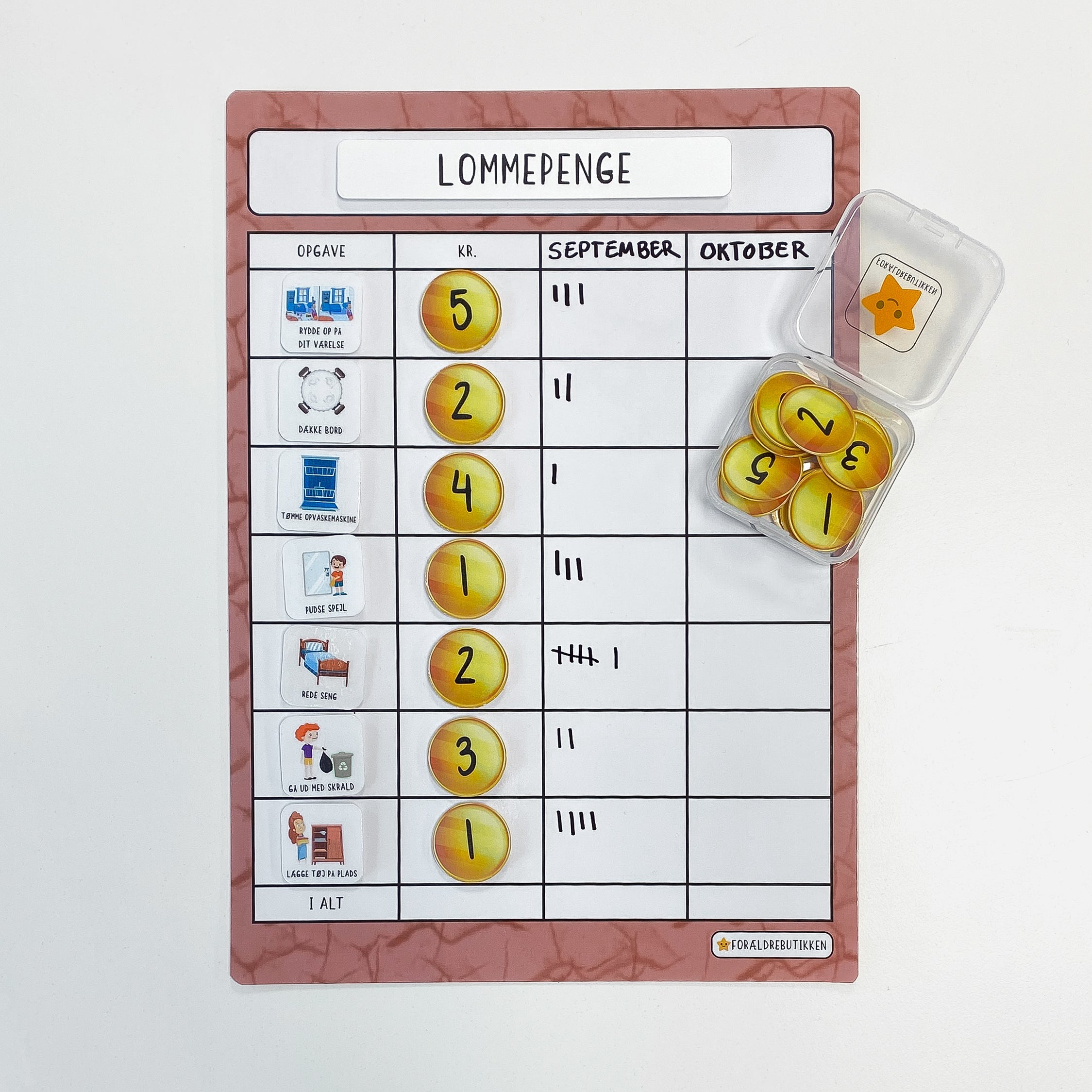 I denne pakke får du en lommepengetavle med 20 mønter