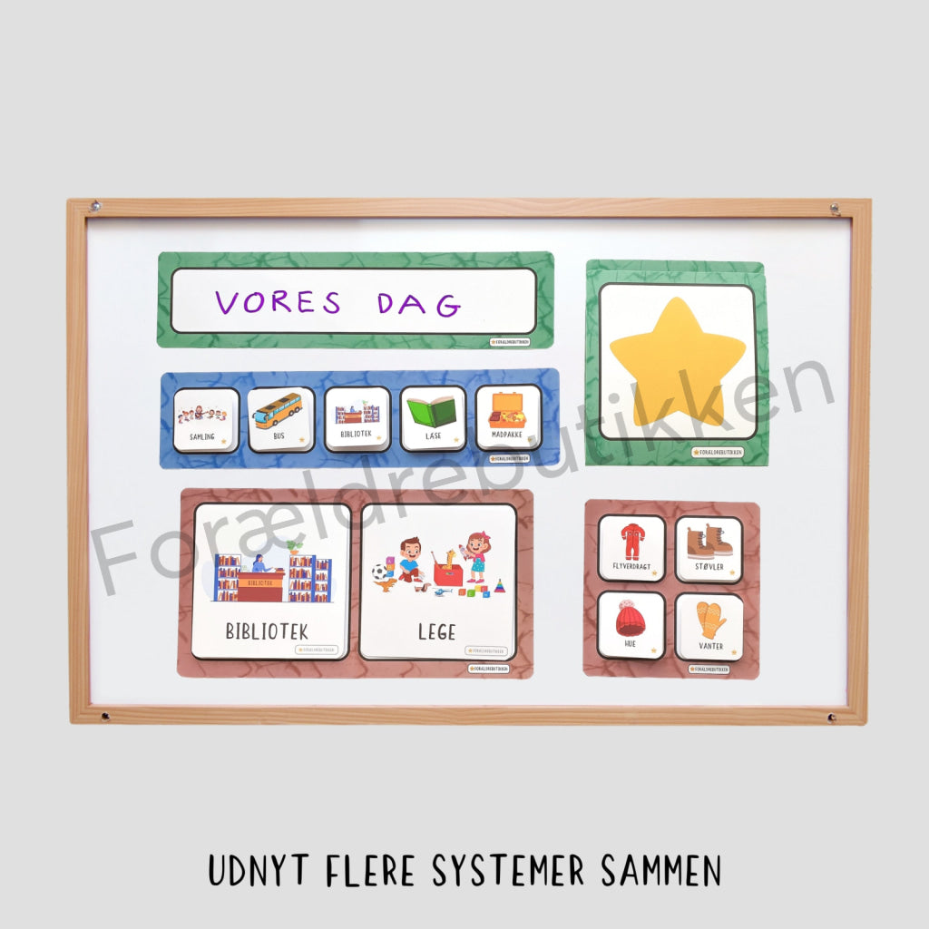 Ja, vi har velcro bagsiden af piktogrammerne og forsiden af tavler, tjeklister, skema, kalender og strimmel. Hvis du ønsker at produkterne skal op og hænge anbefaler vi at tilkøbe en selvklæbende magnetisk plade eller velcro som sættes bag på tavlen/tjeklisten/skemaet/kalenderen mm.