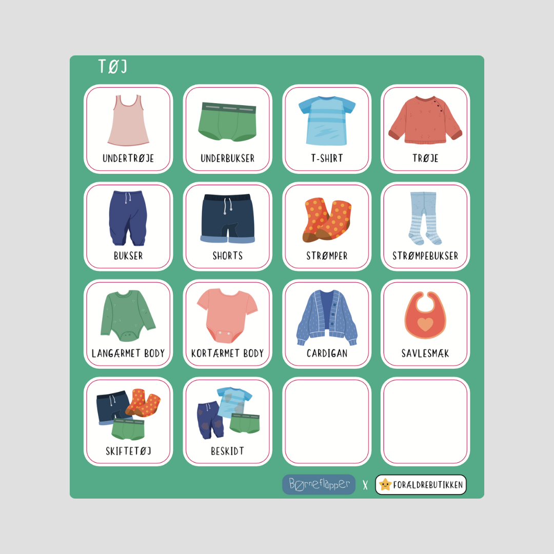 Klistermærkerne er ideelle til skiftetøjsposer, garderober, skabe, skuffer og kasser, hvor tydelig visuel mærkning skaber ro og struktur i hverdagen.
