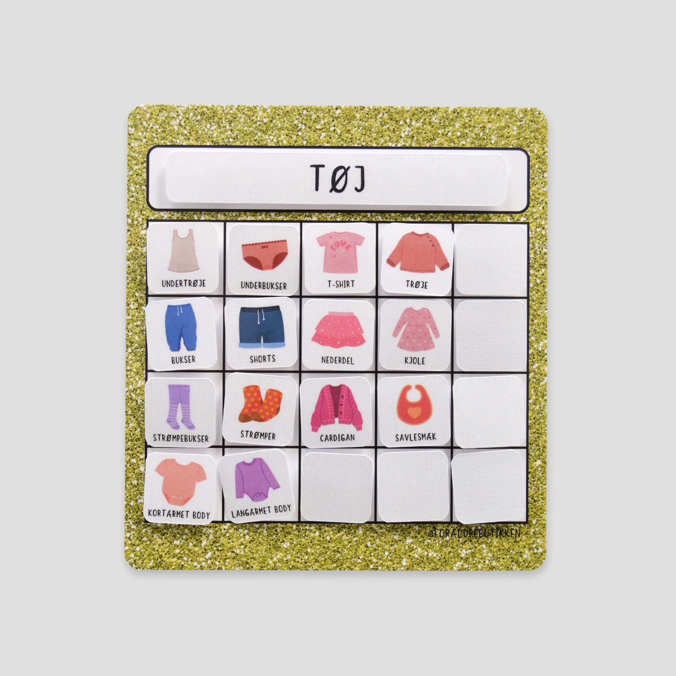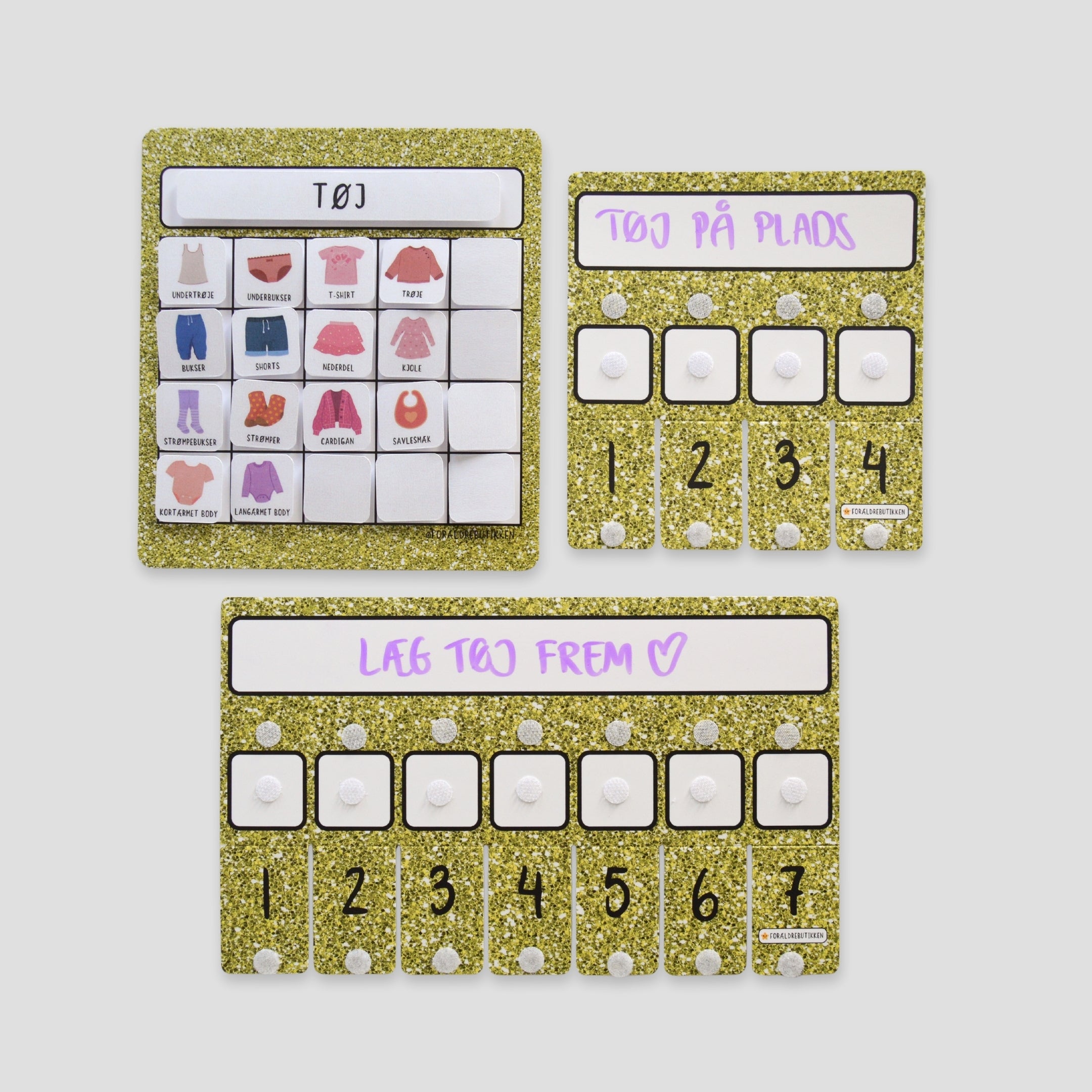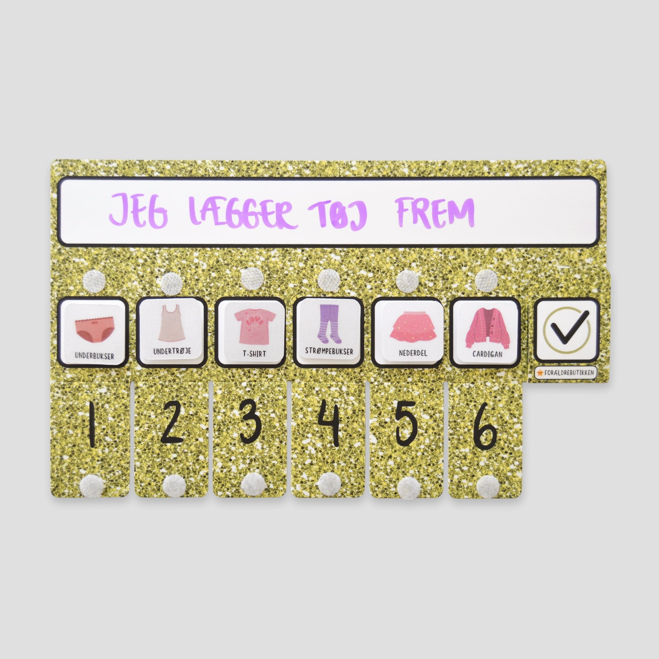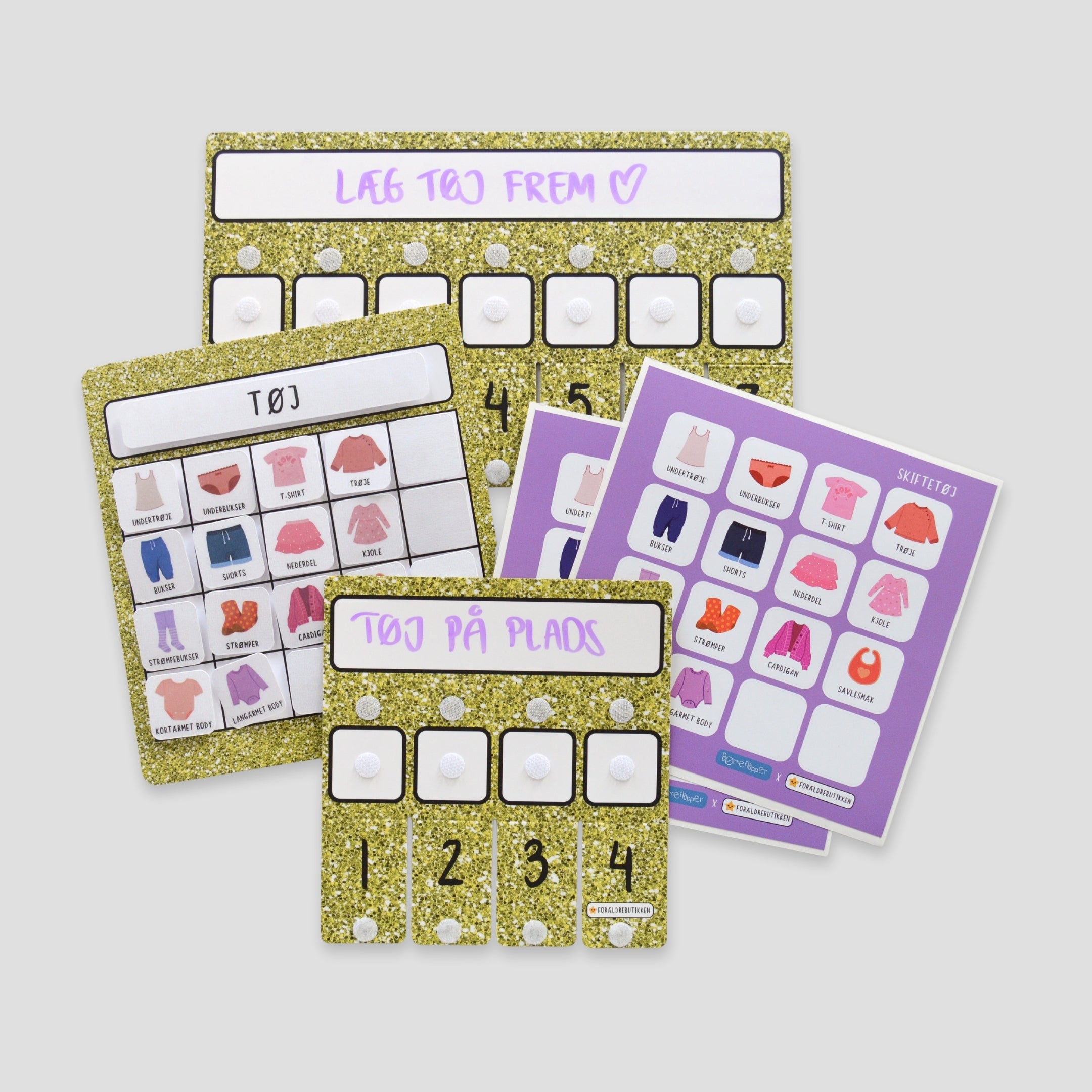 Denne pakkeløsning er udviklet til at støtte børn i at deltage aktivt i tøjrutiner – både når tøj skal tages på, lægges på plads og findes frem igen. Med tjeklister, piktogrammer og klistermærker får barnet et tydeligt visuelt overblik over hvad der hører til hvor, og hvad næste skridt er.